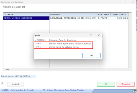 Na tela de Uso Contínuo, foi adicionado o F8, onde faz o envio da mensagem para os clientes que estão na tela e o F9, onde vai zerar a data de envio da tabela USOCON para poder reenviar a mensagem para todos os clientes. Os produtos que vão ser enviados na mensagem são os que estão dentro do prazo do uso continuo.