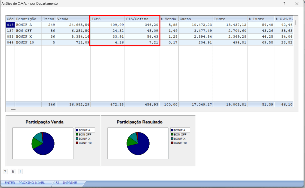 Relatório de Análise de CMV permite incluir os impostos de saída dos produtos com débito / crédito de ICMS