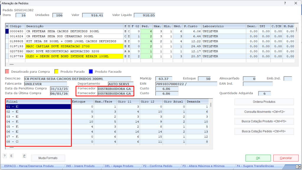 1) Na tela de pedidos em processo, os campos de fornecedor e filial foram alterados para exibir a descrição em vez do código.
